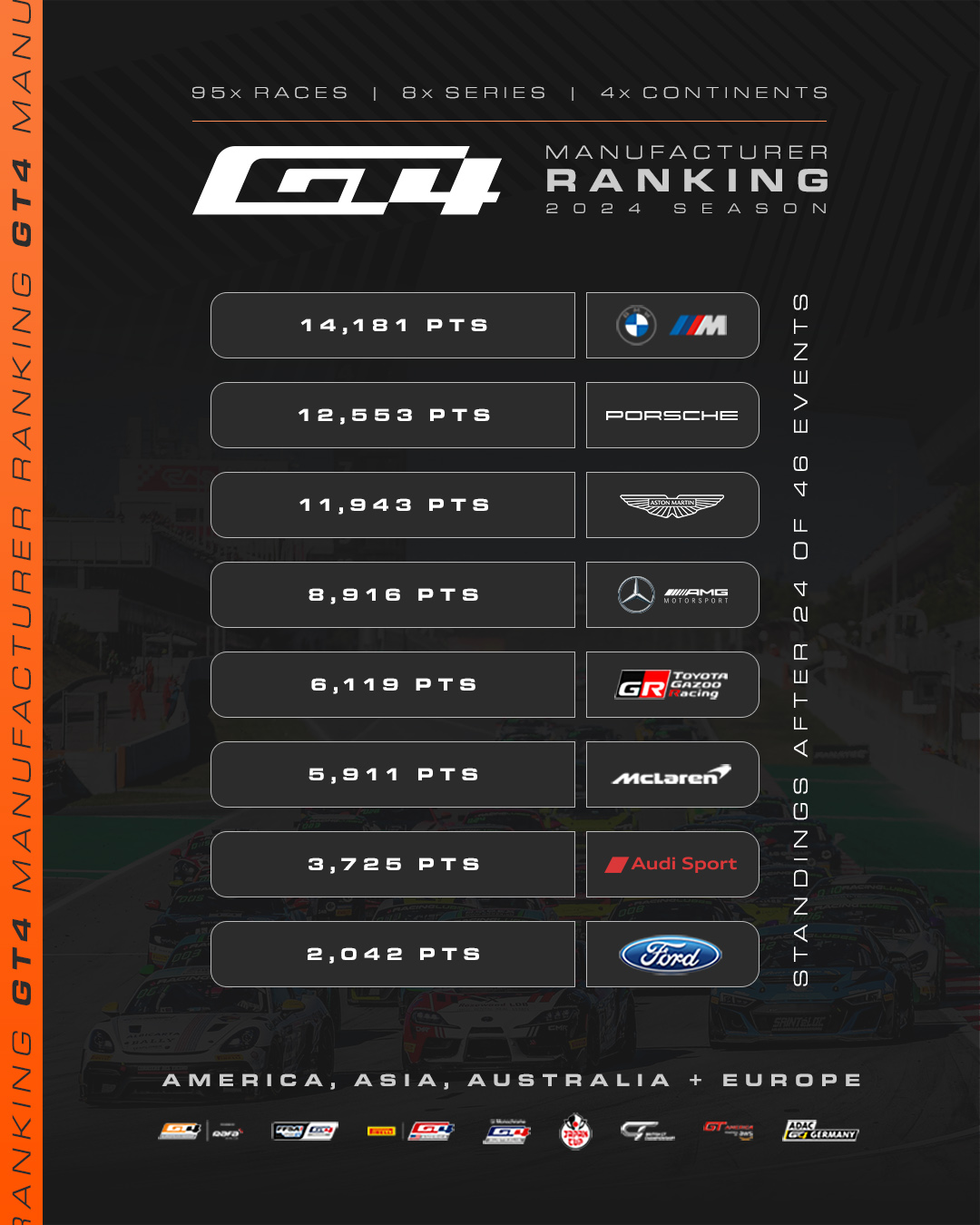 BMW has stretched its advantage at the top of the GT4 Manufacturer Ranking, while Porsche is facing increasing pressure from Aston Martin as the season reaches its halfway point.