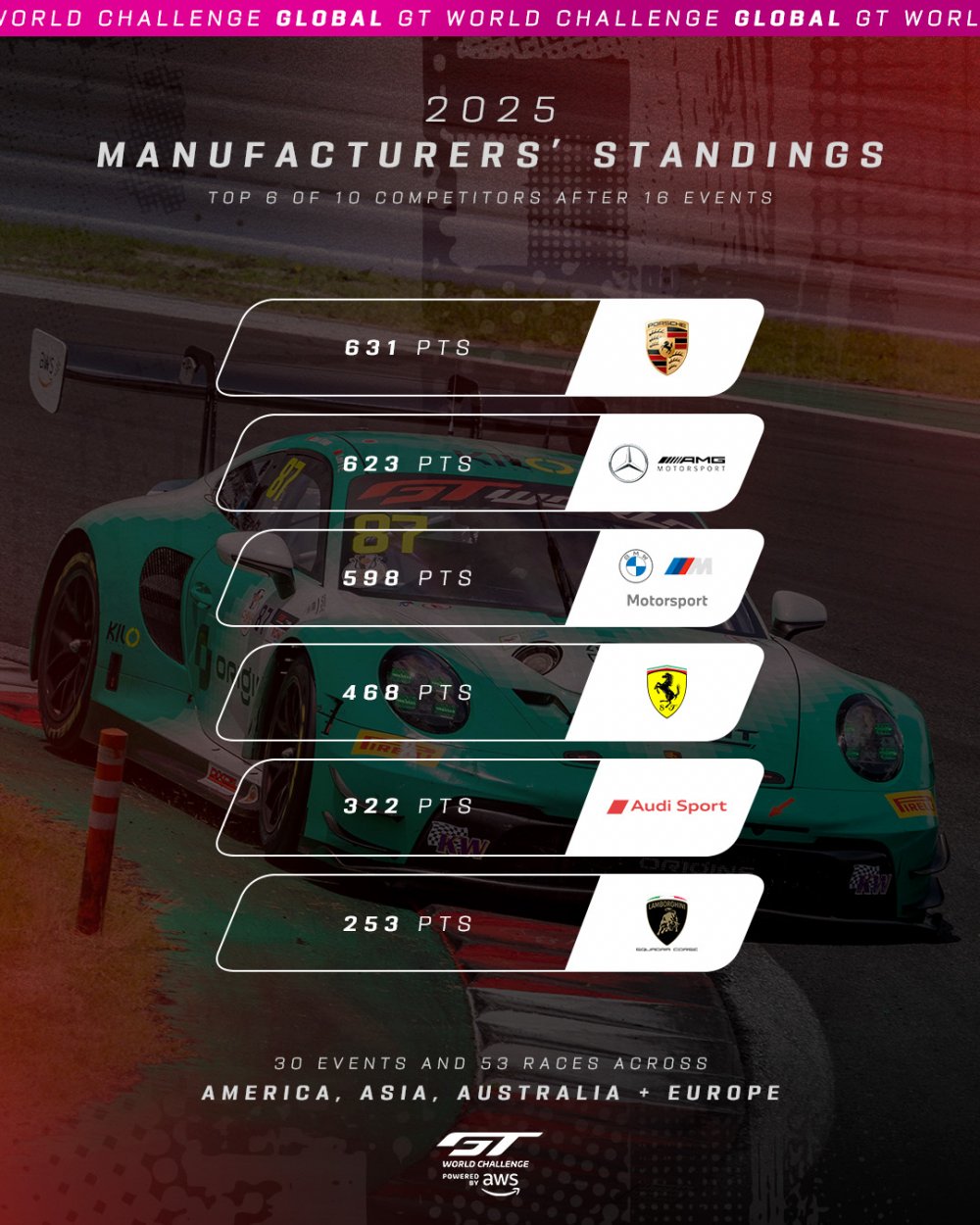 The result netted the Sant'Agata Bolognese brand 100 points, though it was narrowly beaten by its Italian rival Ferrari, which scored 108 thanks to AF Corse – Francorchamps Motors finishing third and fourth. This represents the biggest score of 2025 and cannot be beaten over the remainder of the campaign. BMW and Porsche also performed well at Spa, but it was a bad day for Mercedes-AMG with its best entry coming home ninth. This significantly reduced the gap at the top, with BMW just six points back and Porsche closing to within 42.