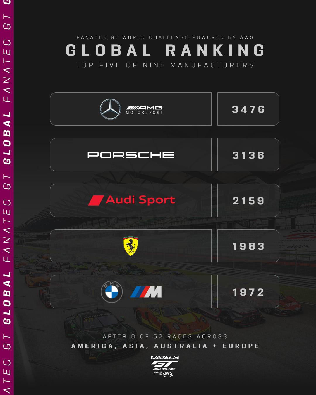 With all four series now up and running, the table shows Mercedes-AMG on top with 3,476 points, though an outstanding weekend in Asia has brought Porsche to within striking distance on 3,136. Audi sits third on 2,159, leading a close-fought battle between Ferrari (1,983) and BMW (1,972).