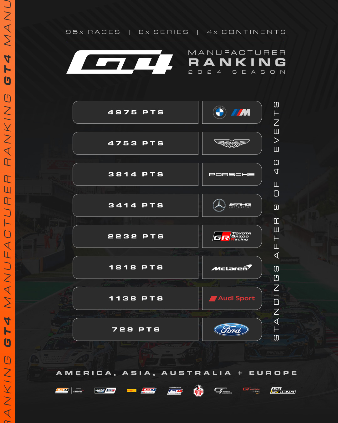 BMW holds a narrow advantage over Aston Martin in the race for the inaugural GT4 Manufacturer Ranking crown, the German brand having emerged on top following a run of nine events in Europe, North America and Australia.
