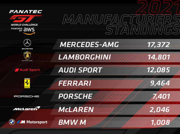 McLaren took sixth position in the standings and will look back on the season with satisfaction after earning a highest-ever finish at the TotalEnergies 24 Hours of Spa. BMW completed the table, its best result coming with a Pro class win in Fanatec GT World Challenge America Powered by AWS at Elkhart Lake. The brand will hope for more victories in 2022 when its hotly anticipated new M4 GT3 arrives on-track across the globe.